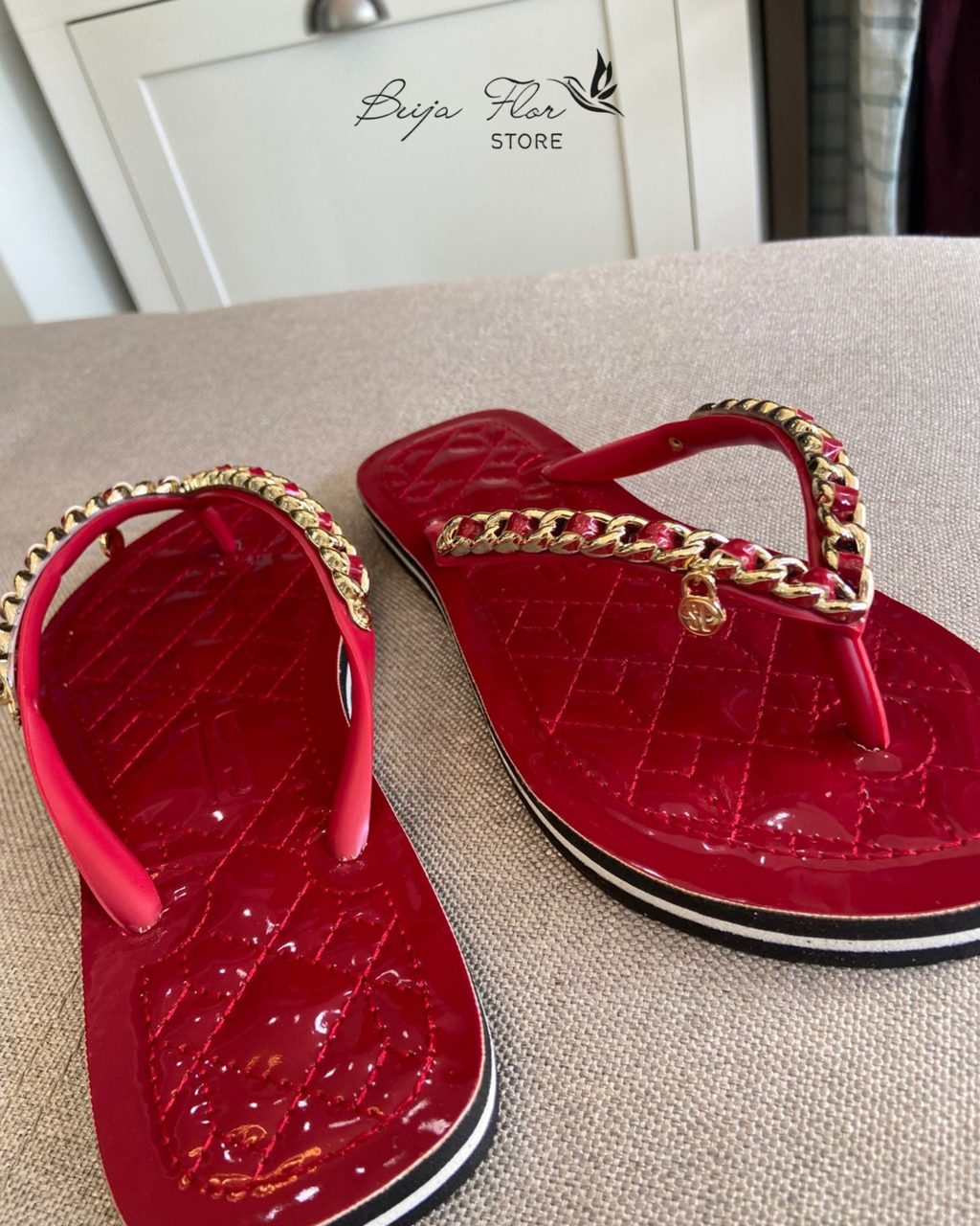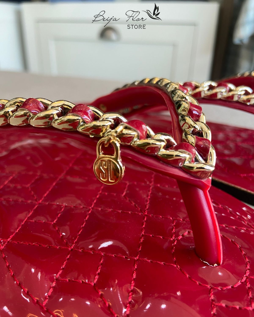 O Chinelo Santa Lolla Verniz Corrente combina o brilho intenso do verniz com o toque sofisticado da corrente dourada — um detalhe que transforma o simples em marcante.
